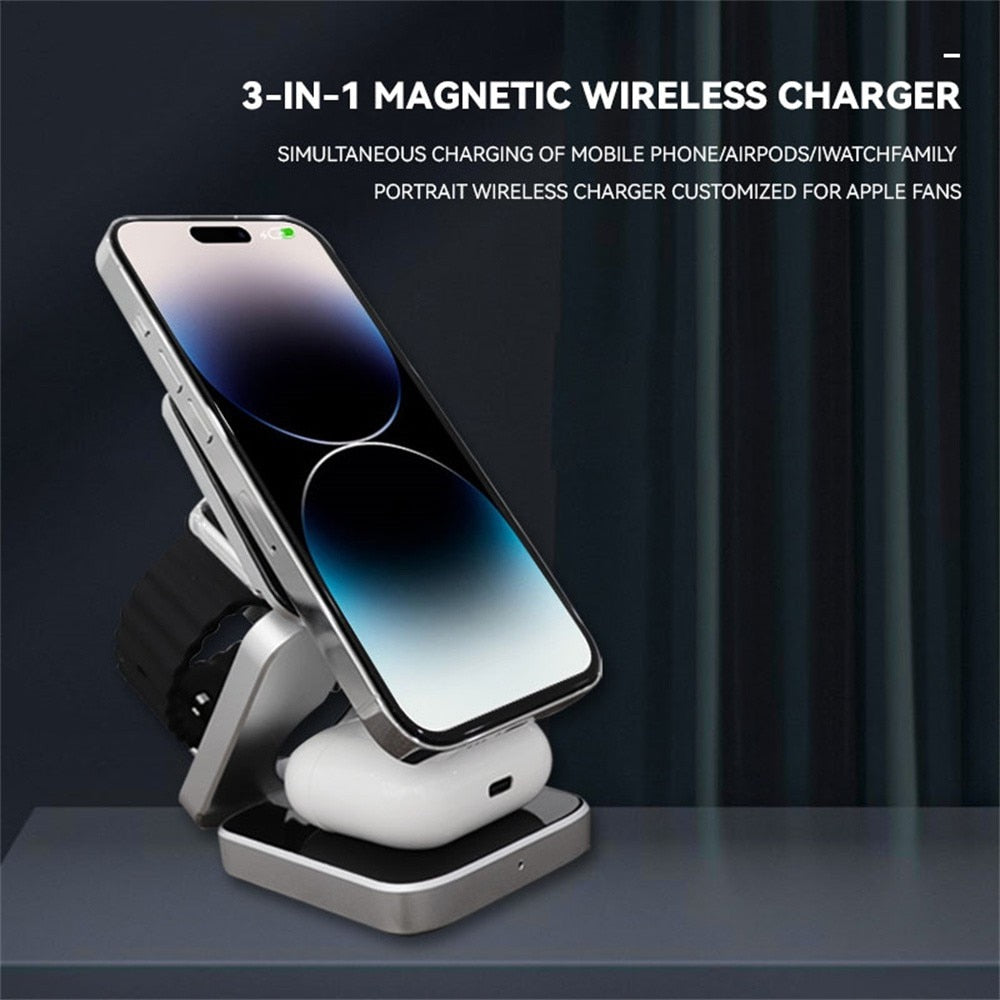 This compact 3 in 1 charger powers your iPhone, Apple Watch, and AirPods simultaneously. Built-in magnets align your iPhone 12-14 series for optimized wireless charging.